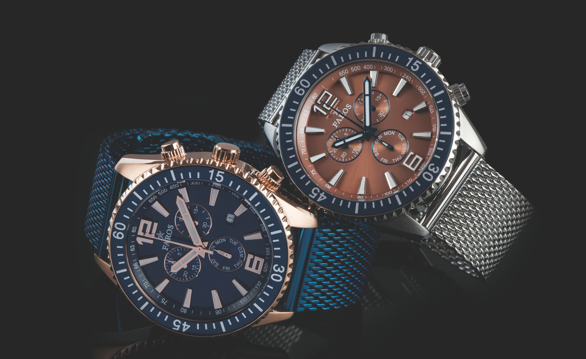 La même année, le groupe élargit son portefeuille avec la création de la marque Faros, visant à toucher un public plus large en proposant des modèles alliant sportivité, performance et design moderne. Chaque marque du groupe RIBA WATCH se distingue ainsi par une approche unique, capturant différents segments du marché horloger : du sport à l’élégance, en passant par la haute technique.